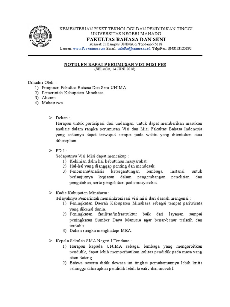 Contoh notulen rapat harus anda pahami dengan baik agar tidak terjadi kekeliruan saat anda diberi tugas menulis notulen untuk rapat yang anda ikuti. Yang mengacu pada visi dan misi. Notulen rapat penyusunan visi dan misi sekoah27. Bab ii visi dan misi. Berikut contoh visi dan misi dari unicorn indonesia.